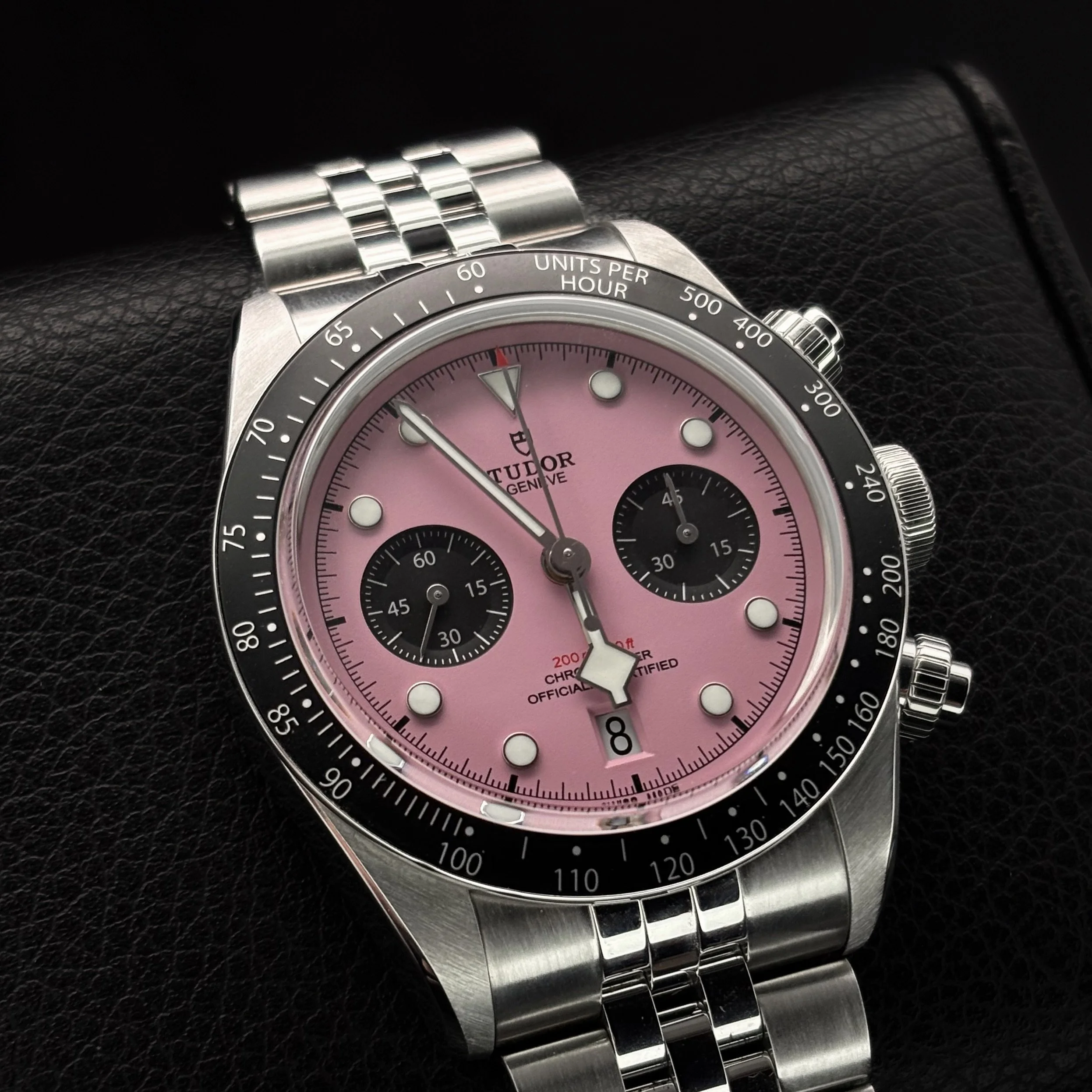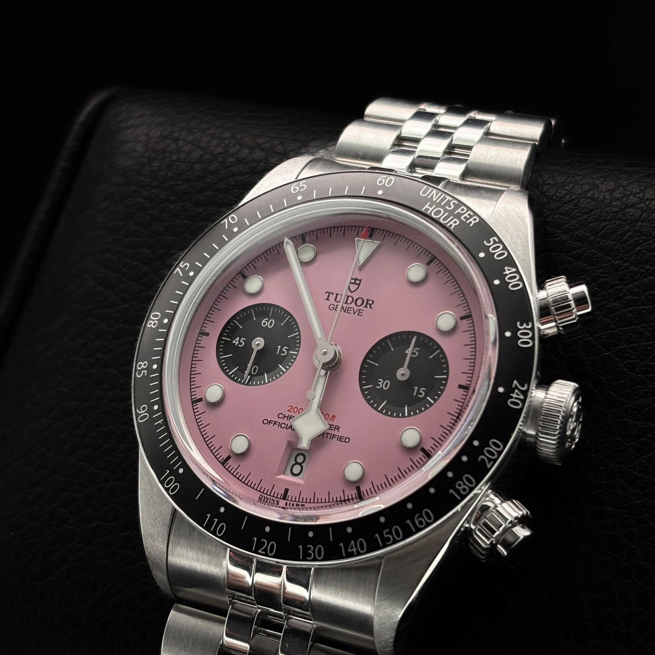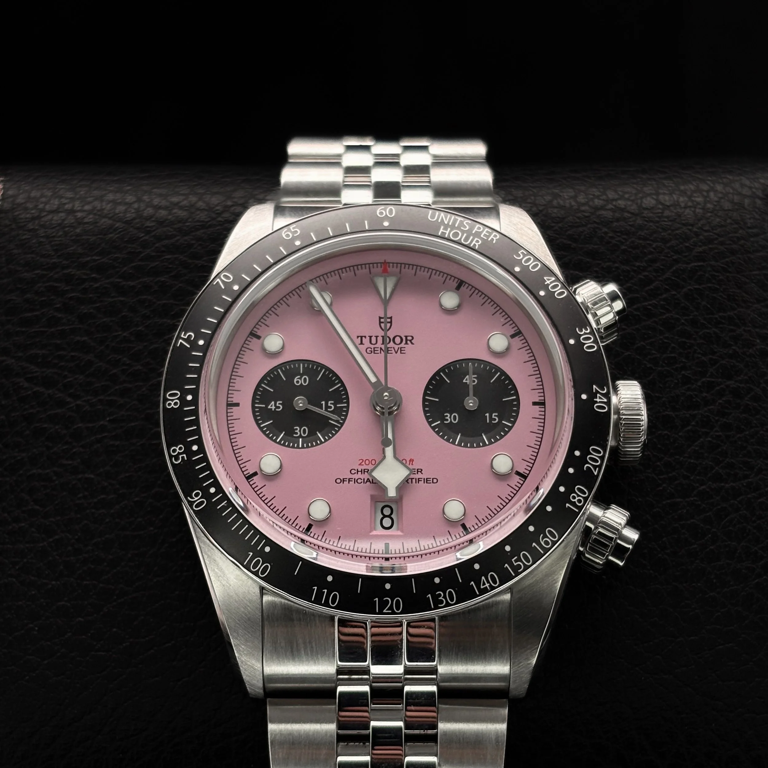 INVENTORY Categories: Select a Category Tudor Audemars Piguet Zenith Hublot Bell & Ross Breitling Cartier Rolex Omega Panerai Tudor Black Bay Chrono Pink Dial "Flamingo Pink" 41mm M79360N-0019 USD 10,300.00