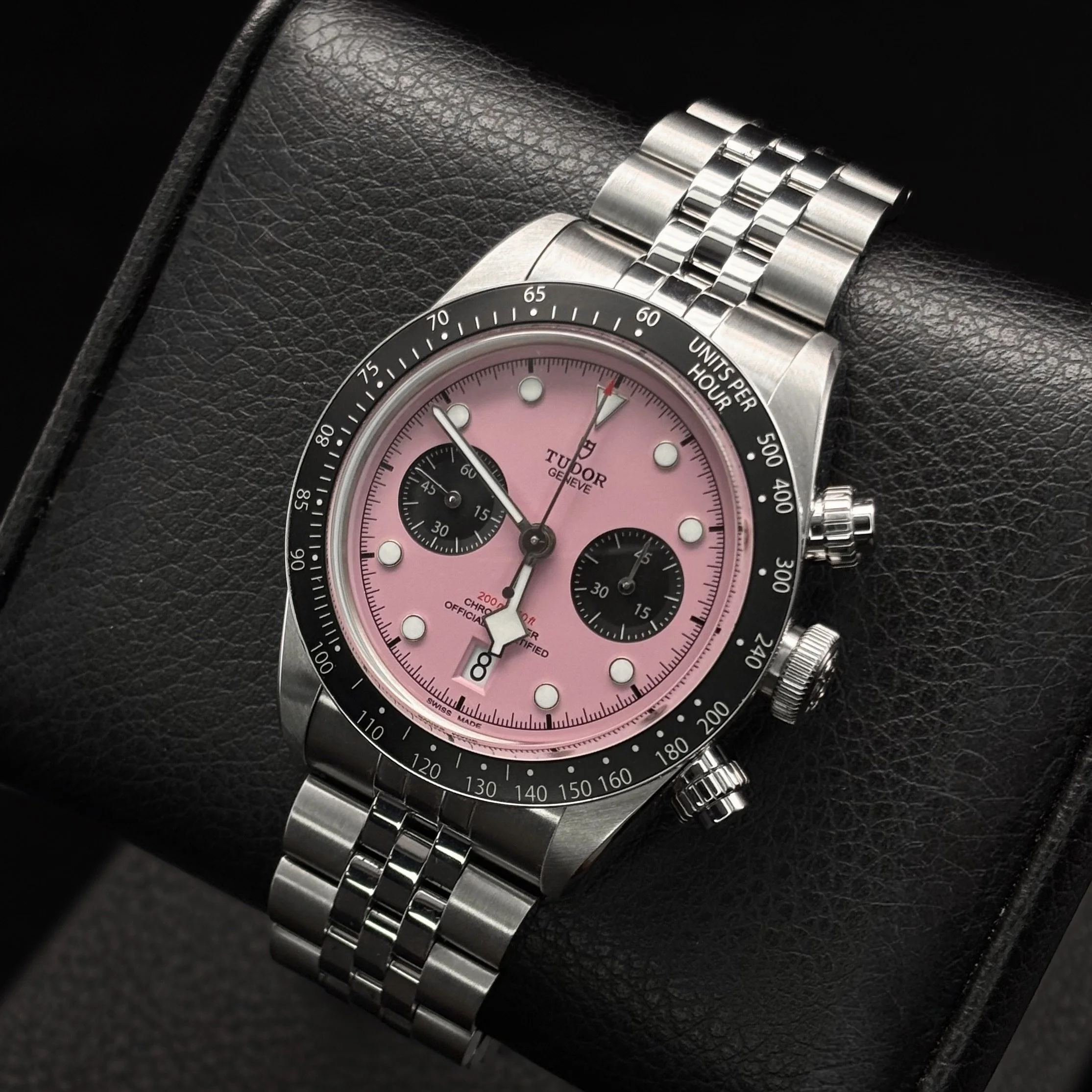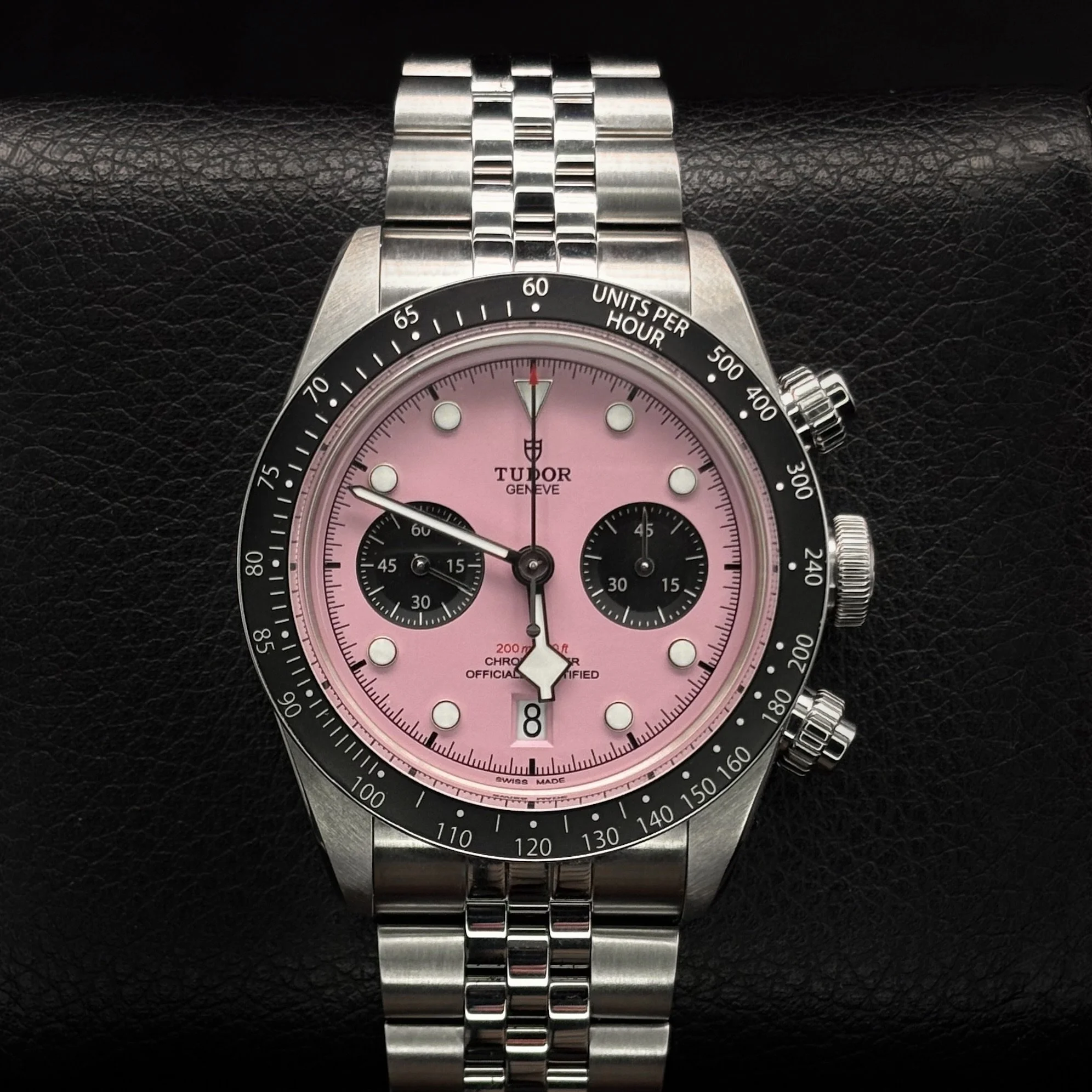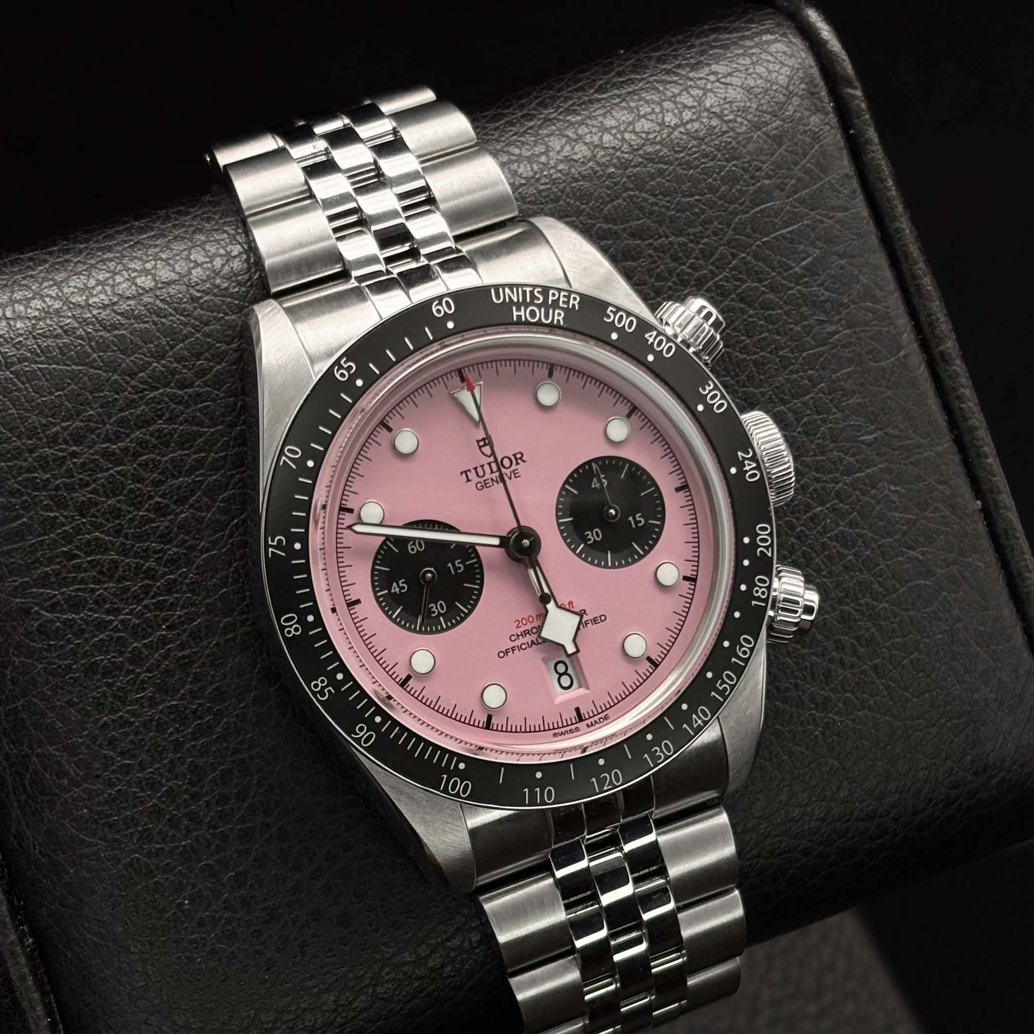 INVENTORY Categories: Select a Category Tudor Audemars Piguet Zenith Hublot Bell & Ross Breitling Cartier Rolex Omega Panerai Tudor Black Bay Chrono Pink Dial "Flamingo Pink" 41mm M79360N-0019 USD 10,300.00